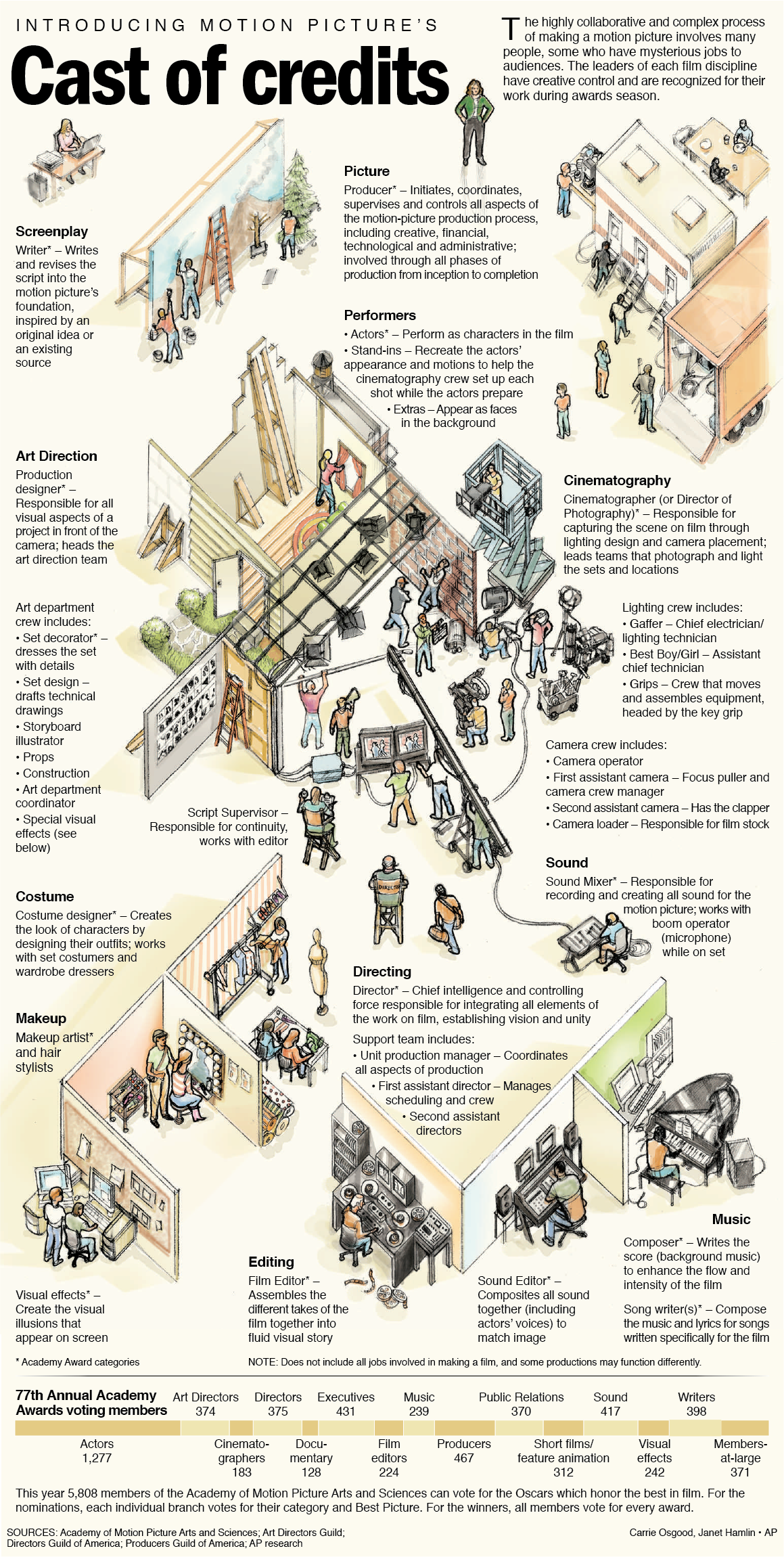 Carrie collaborated with an illustrator in this Academy Award-themed graphic on the many different jobs that contribute in making movies.